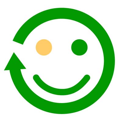 子供から大人まで誰からも愛され、見て愉しいイメージとして笑顔のマークにしました。顔の輪郭でリサイクルを意味しています。 環境を考えるという意味で、全体を緑で!片方の淡いオレンジ色は環境を明るく照らすライトのイメージです。