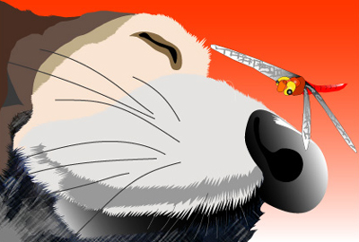 ぐっすりおやすみのバセットバウンドを赤とんぼが眺めています。